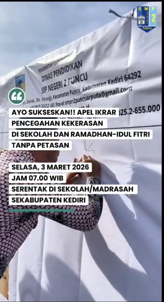 Kediri-Dalam rangka menyambut bulan suci Ramadan, seluruh sekolah melaksanakan kegiatan “Ikrar Ramadan Tanpa Petasan dan Kekerasan” sebagai wujud komitmen menciptakan lingkungan yang aman, tertib, dan penuh kedamaian. Kegiatan ini dihadiri oleh jajaran Kepolisian Sektor (Polsek), Komando Rayon Militer (Koramil), serta Camat setempat yang memberikan dukungan penuh terhadap pembinaan karakter generasi muda.
